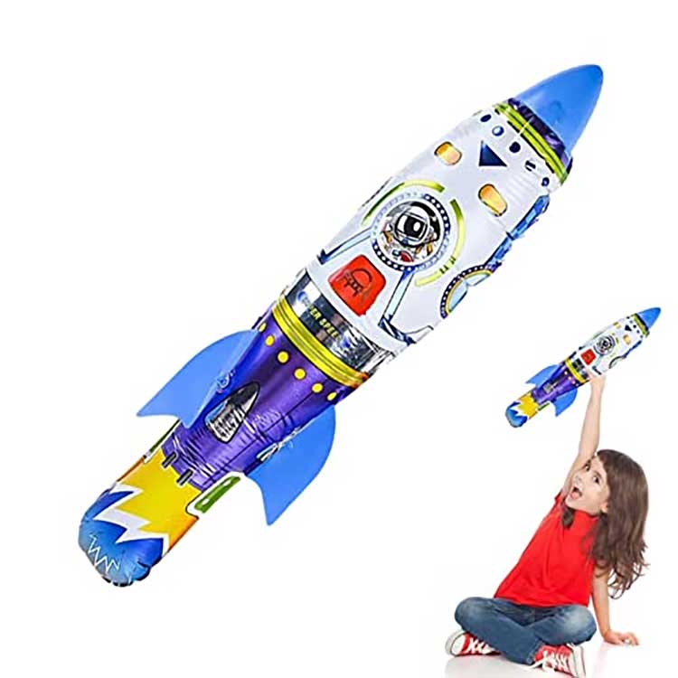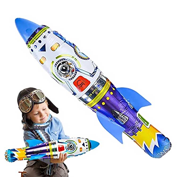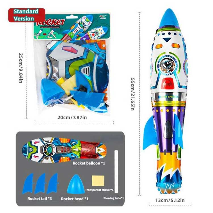 A 3D rakétafóliás ballondobáló felfújható hosszú, szabálytalan formájú felfújható játék, felületére rakétához kapcsolódó mintákkal nyomtatva. A fej- és farokbordákat kézzel kell összeszerelni, majd felfújás után felszerelni. Alumíniumfóliából készült, nem törik könnyen és tartós. Alkalmas űrjátékok, témájú gyerekparti dekorációra.