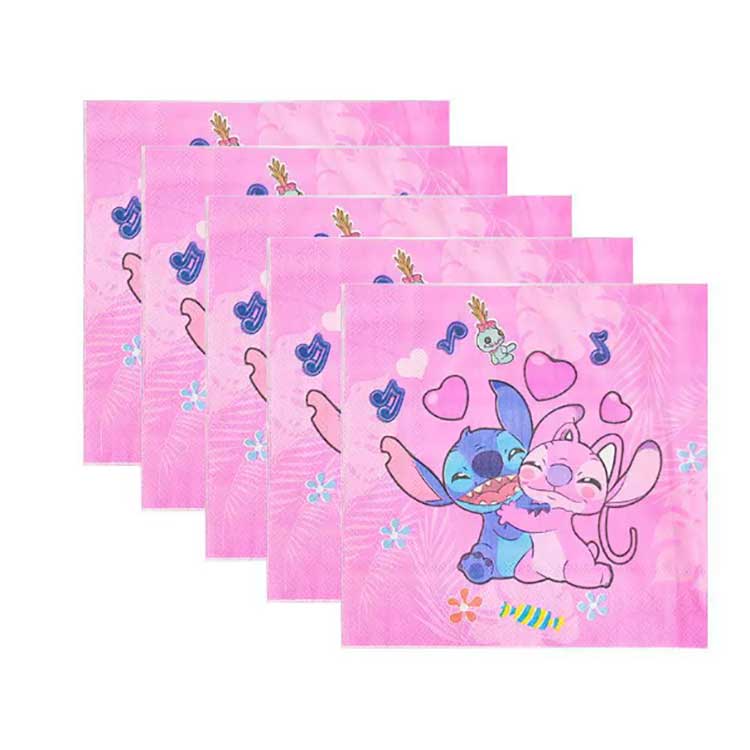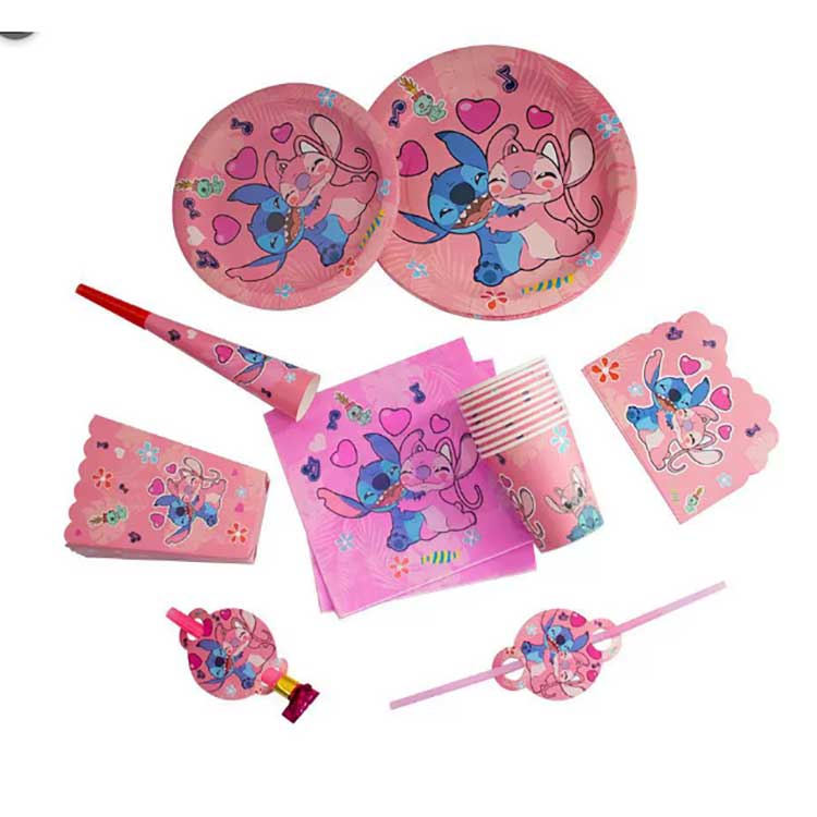 Egy Stitch eldobható tányérkészlet a következő termékeket tartalmazza: 7 hüvelykes tányérok (10db/zsák), 9 hüvelykes tányérok (10db/táska), szalvéták (20db/táska), zászlók (10db/zsák), ajándékcsomagok (10db/táska), pattogatott kukorica dobozok (6db/zsák), pattogatott kukorica dobozok (6db/zsák), g (6db/táska), papírpoharak (10db/táska), szarvak (6db/zsák), szívószálak (10db/zsák), meghívók (10db/táska), maszkok (10db/táska), kanalak, evőeszközök (10db/táska) és terítő (1db/zsák). A készlet 17 különböző terméktípust tartalmaz. Az ügyfelek választhatnak, hogy a teljes készletet megvásárolják, vagy csak a tételek egy részét választják ki igényeiknek megfelelően.